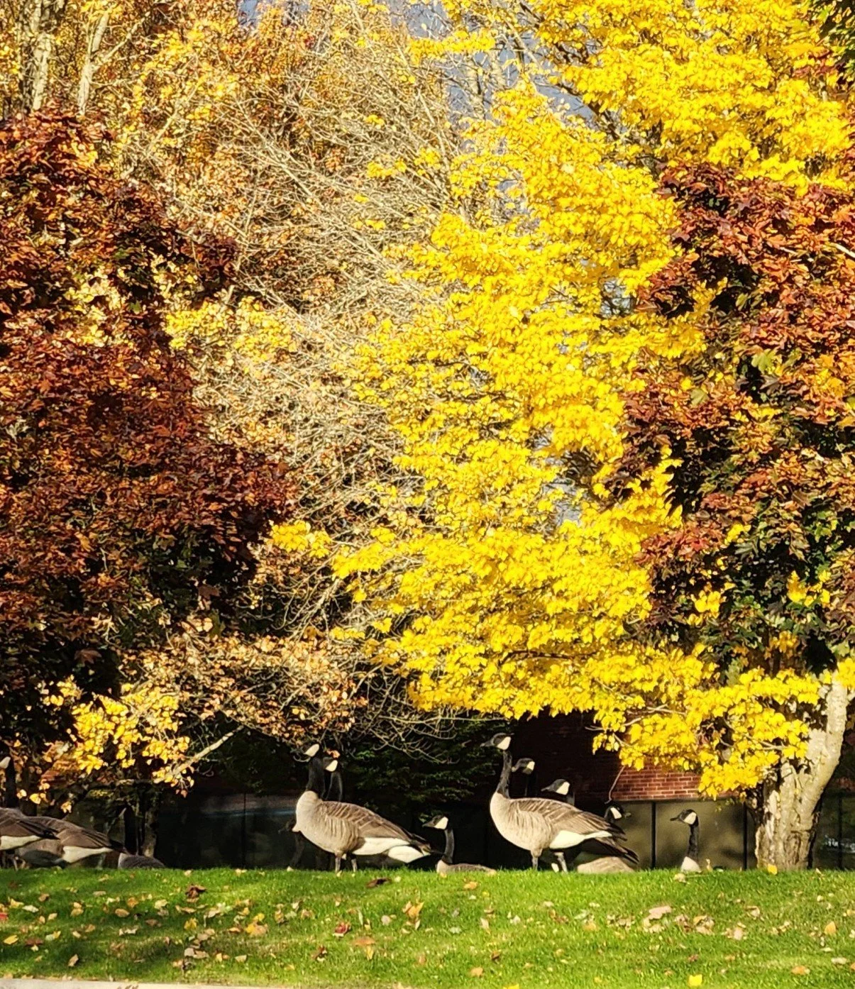 A cool Fall Day with a descending sun and rain on the horizon found me walking my two poodles around an unfamiliar suburban medical center in Beaverton, Oregon. Orange and red leaves lined the sidewalks surrounding grassy slopes which led to a small berm parallelling a busy road. It looked like a safe place for the dogs to poop, so I headed toward it when something moved. There, a group of Canada Goose eyed me nervously, slowly drifting away hoping to avoid taking flight. I broke off my approach, watching the large, adult fowl own the mound with a confident dignity. I took a few photographs and let them be.