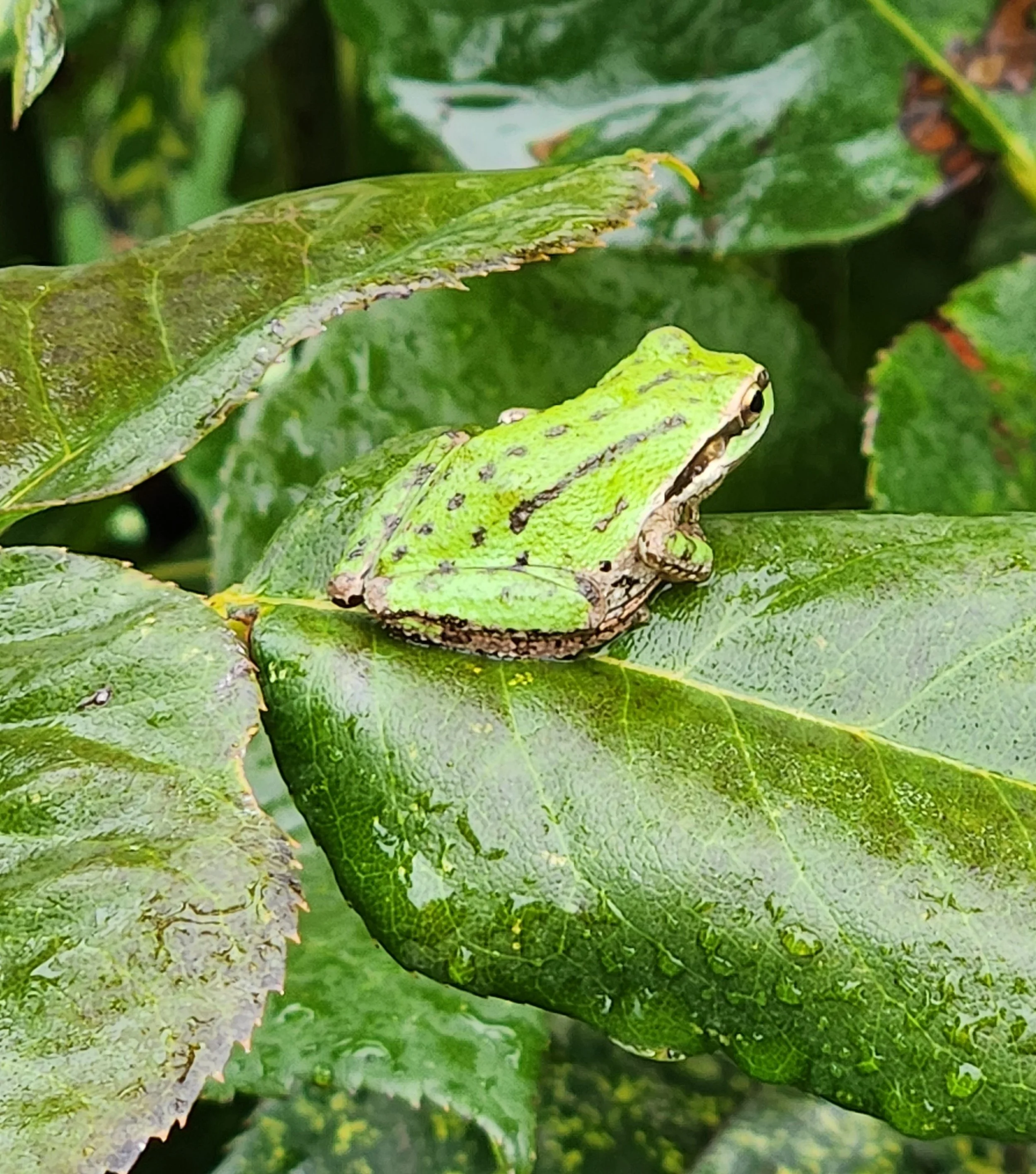 This spring, I have had a gathering upon my roses that was a most unexpected surprise. As the last hot days of summer slipped away into the warm afternoons of Fall, a number of tree frogs began placing themselves among the leaves, and between the petals of the blooms. They varied in size from just larger than a pea, to a proper fifty cent sized old timer. Depending on their choice of placement, these hunters awaiting on a meal attracted by the flowers would range from golden browns to lime greens. The backyard collection of color and sweet scents represent rose bushes over 50 years old, with grand thick barky bases and a variety of fauna ranging from hummingbirds to garter snakes. I came to adore the frogs though, who collected in number just before dawn, and would tolerate my inquisitive photography each morning.